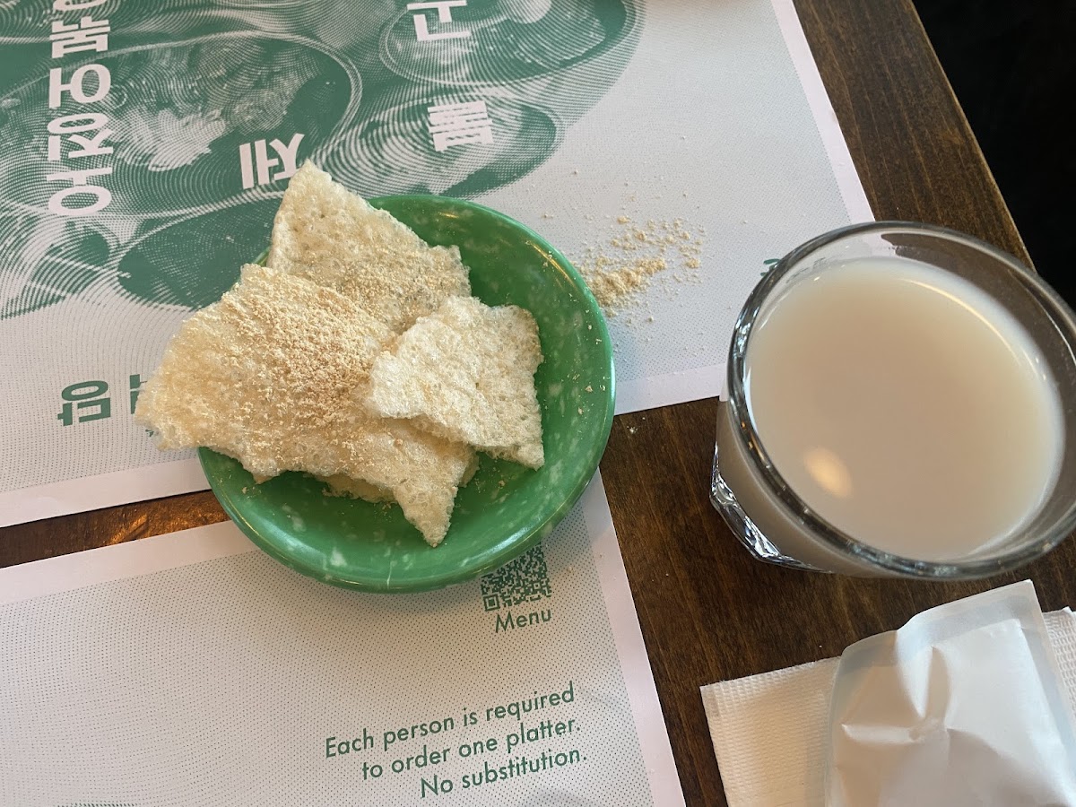 I know this ain’t no lowkey hidden gem but despite the hype it did nottt disappoint. Kinda pricey coming in at an inflexible $36 (no other options, must order 1 dish per person). But it’s a lotttt of food and a lot of variety. The banchan are great and pretty unique. We got sashimi, apple mayo salad, kimchi, tofu, chicken wings, japchae etc etc. and all were excellent. The only mid one was maybe the japchae. The bulgogi is a must. It’s even better than the squid imo, but both are great. Don’t leave without a free (very sweet) coffee or black sesame tiny coffee. Delish. Only complaints are that you can’t order less than 1 set per person. And they don’t have sparkling water. Other than that, chefs kiss. No vegetarian options. Good for gluten intolerance.